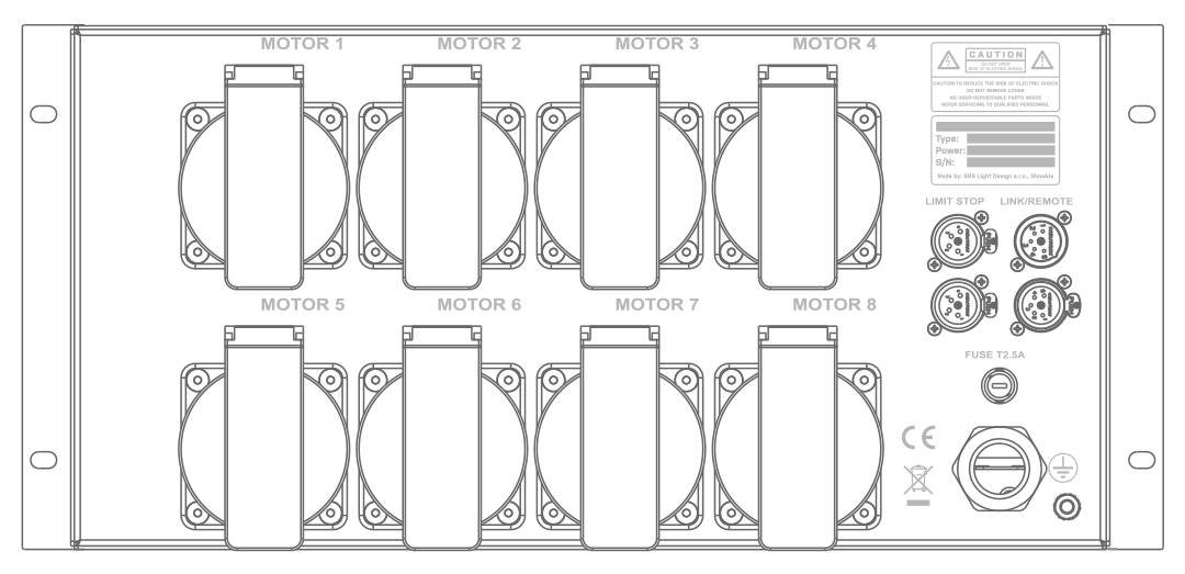 XDDL8 har en CEE 32A input och 8x CEE 16A/4p ut. Den är kompatibel med EXE Rise 250kg, 500kg och 1000kg.